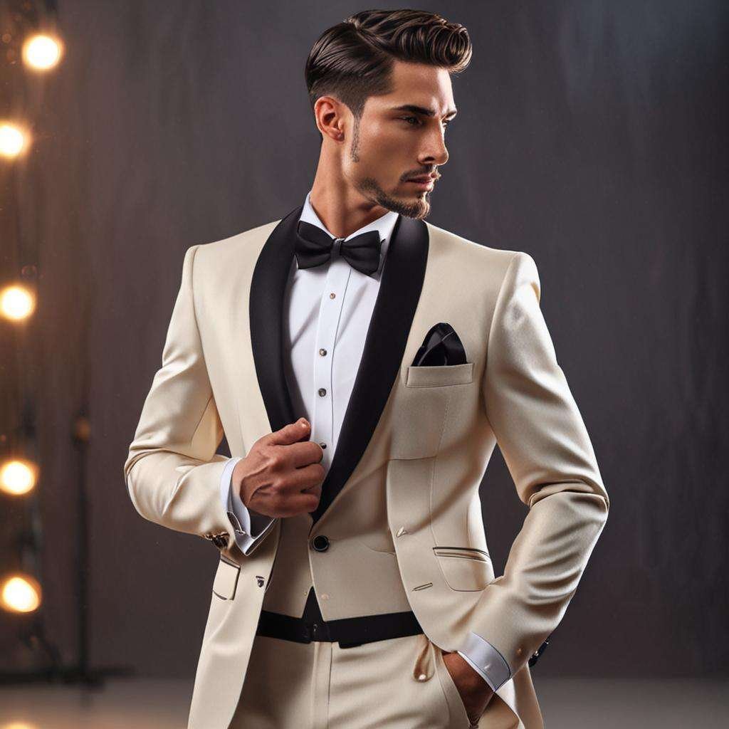 Elevate any formal occasion with this bespoke made-to-measure tuxedo, crafted entirely by hand and inspired by the legendary Al Capone himself. Cut from luxurious champagne-colored fabric, it features a sleek black midnight lapel and intricate detailing that will turn heads wherever you go.