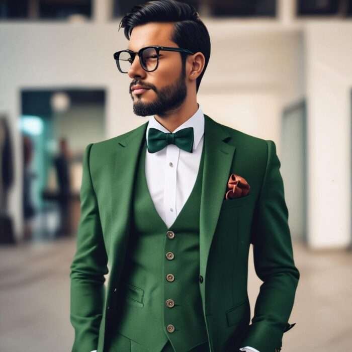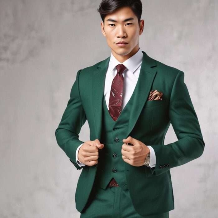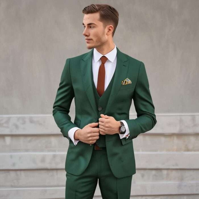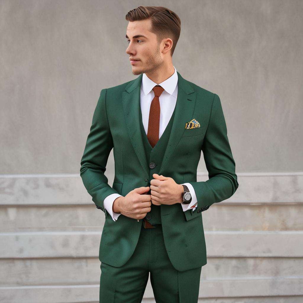 A bespoke, made-to-measure green single-button wool suit with notch lapel and classic vest, crafted from premium materials and designed to fit you perfectly.