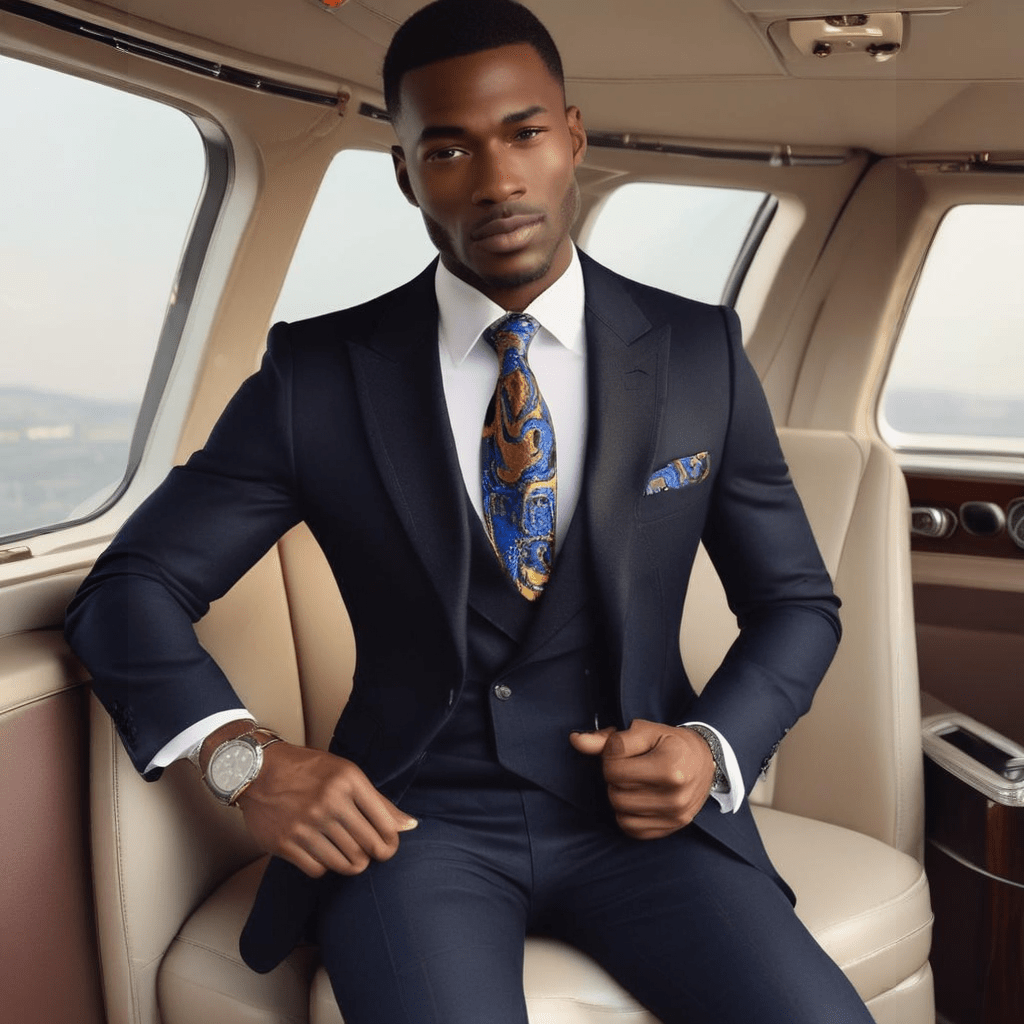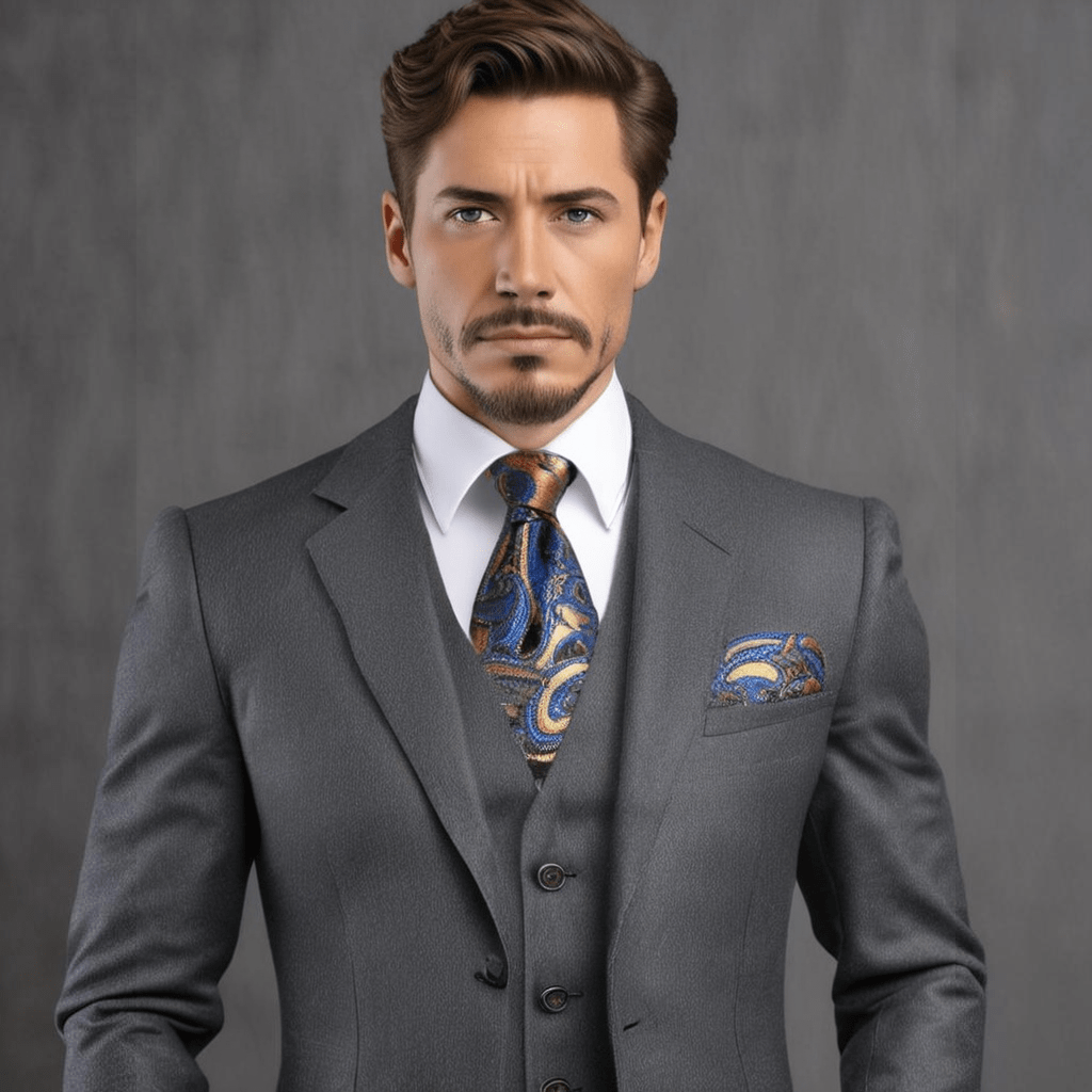 Elevate your style with our bespoke black suit and luxury blue and gold paisley tie. Perfect for weddings, business events, and everyday wear.
